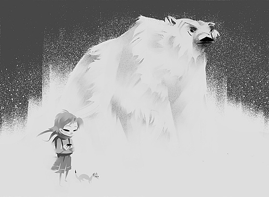 I painted in the sides of the composition with the Chunky Oil Pastel and splattered a few dots on the background for snow. The finer bits of snow were created with the Add Noise filter in Photoshop and then overlayed onto the drawing.
